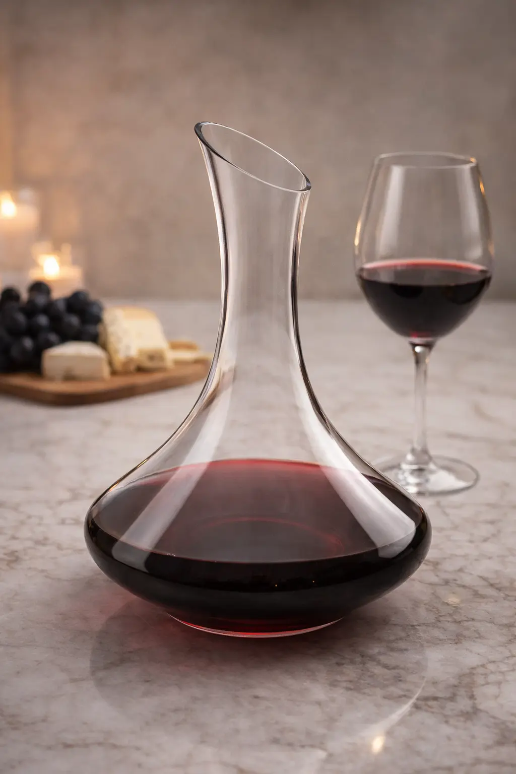 Con su diseño moderno y estilizado no solo realza la presentación en la mesa, sino que también permite oxigenar el vino, ayudando a liberar sus aromas y mejorar su sabor.