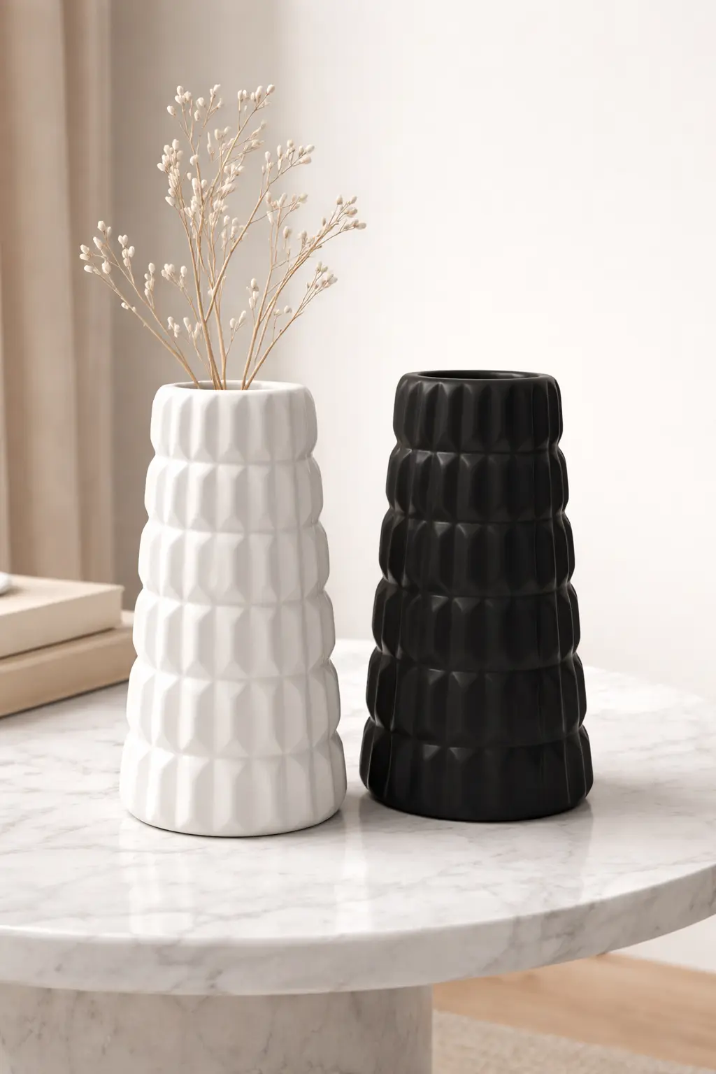 Sumá estilo y personalidad a tus espacios con este elegante florero de cerámica. Su diseño moderno con textura geométrica aporta un toque sofisticado y minimalista que combina perfectamente con cualquier ambiente del hogar.