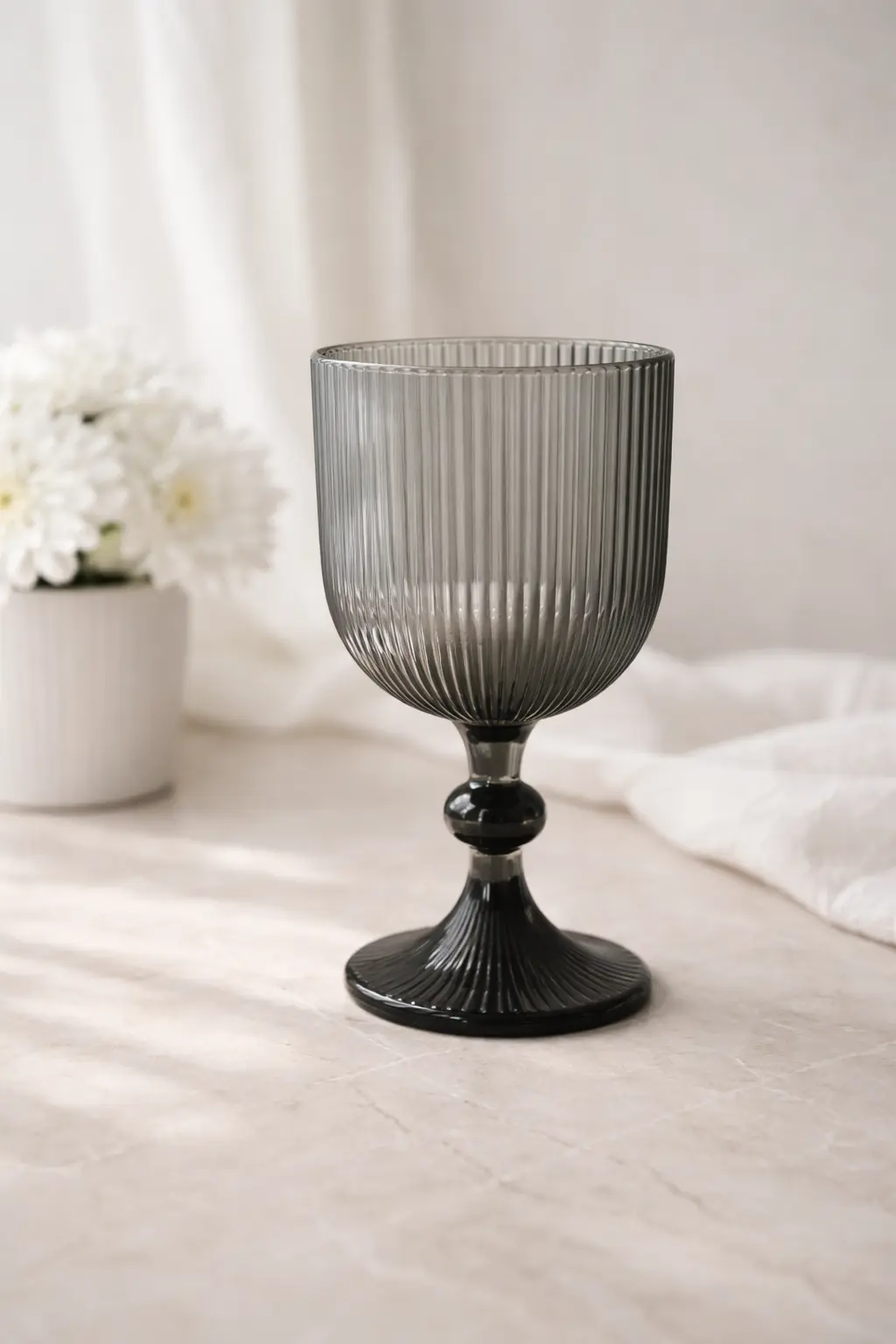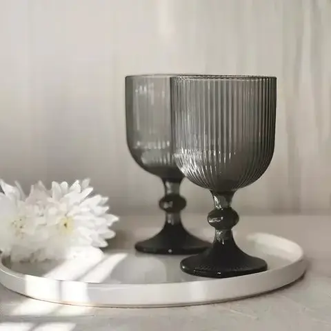 Su acabado gris tornasolado y su textura acanalada reflejan la luz de forma sutil, aportando carácter y estilo a cada brindis.